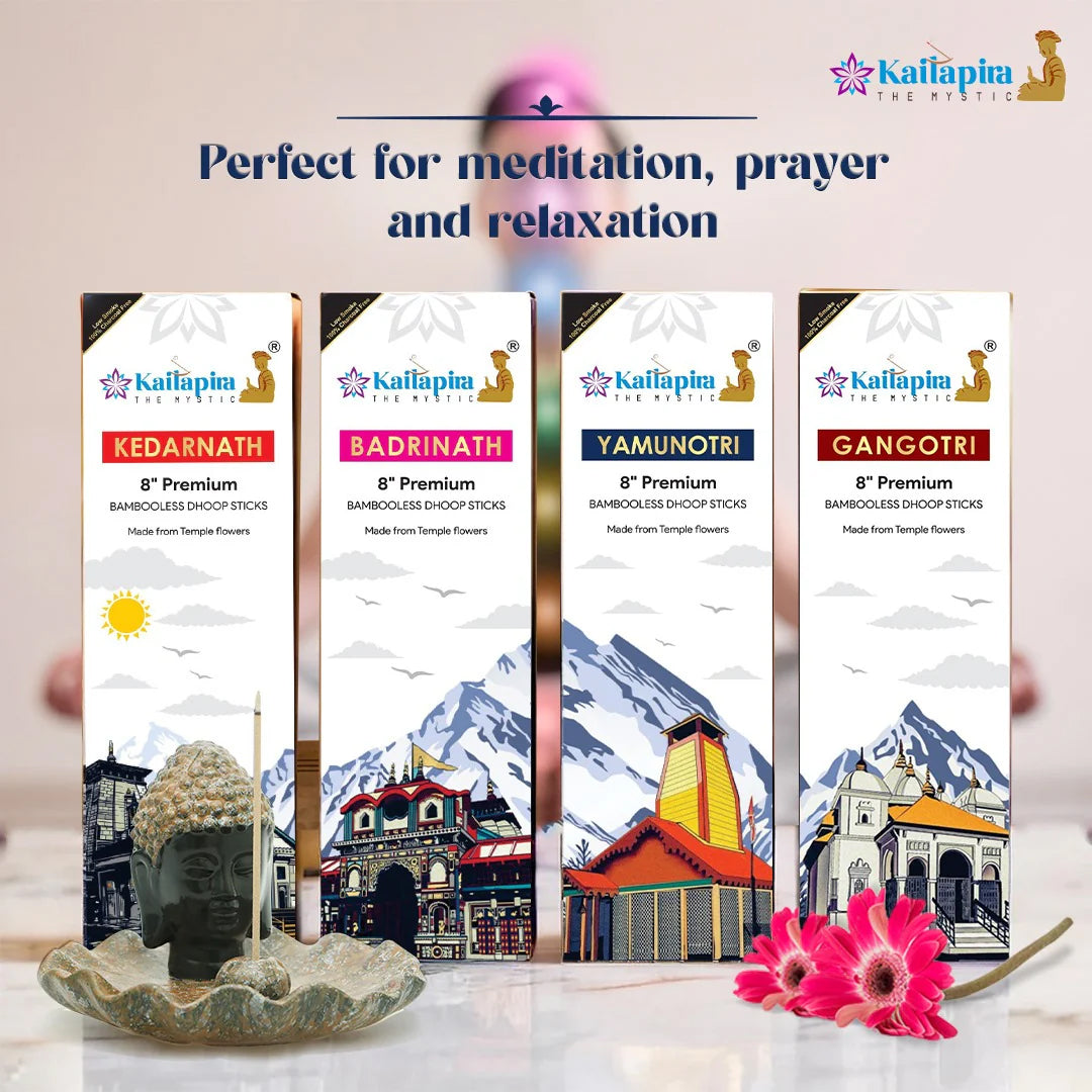 This combo from Kailapira is an assortment of 4 packs of Dhoop batti of fabulous fragrances signifying Chaar Dhaams of India (Kedarnath, Badrinath, Yamunotri, and Gangotri).