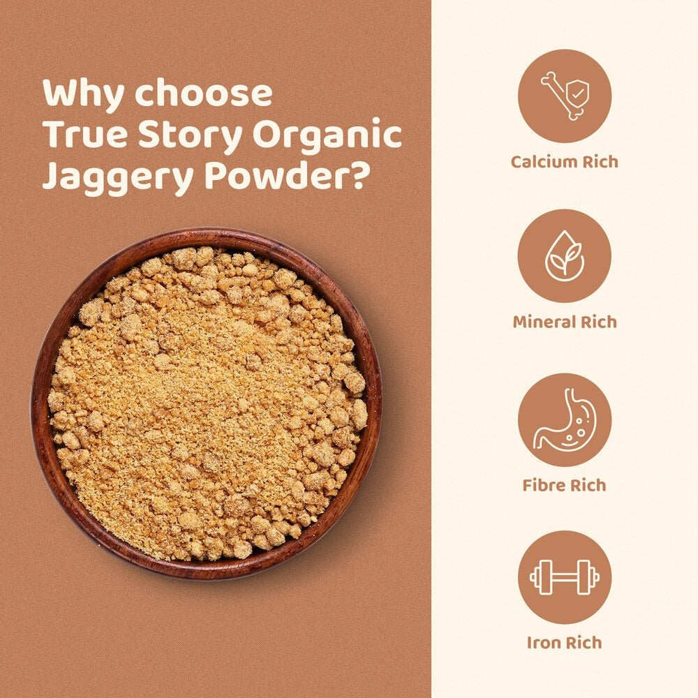 True Story Jaggery Powder is made from pure sugarcane juice and processed using traditional methods to retain its natural color, rich aroma, and deep, earthy sweetness. Soft and easy to use, it blends effortlessly into your favorite recipes.